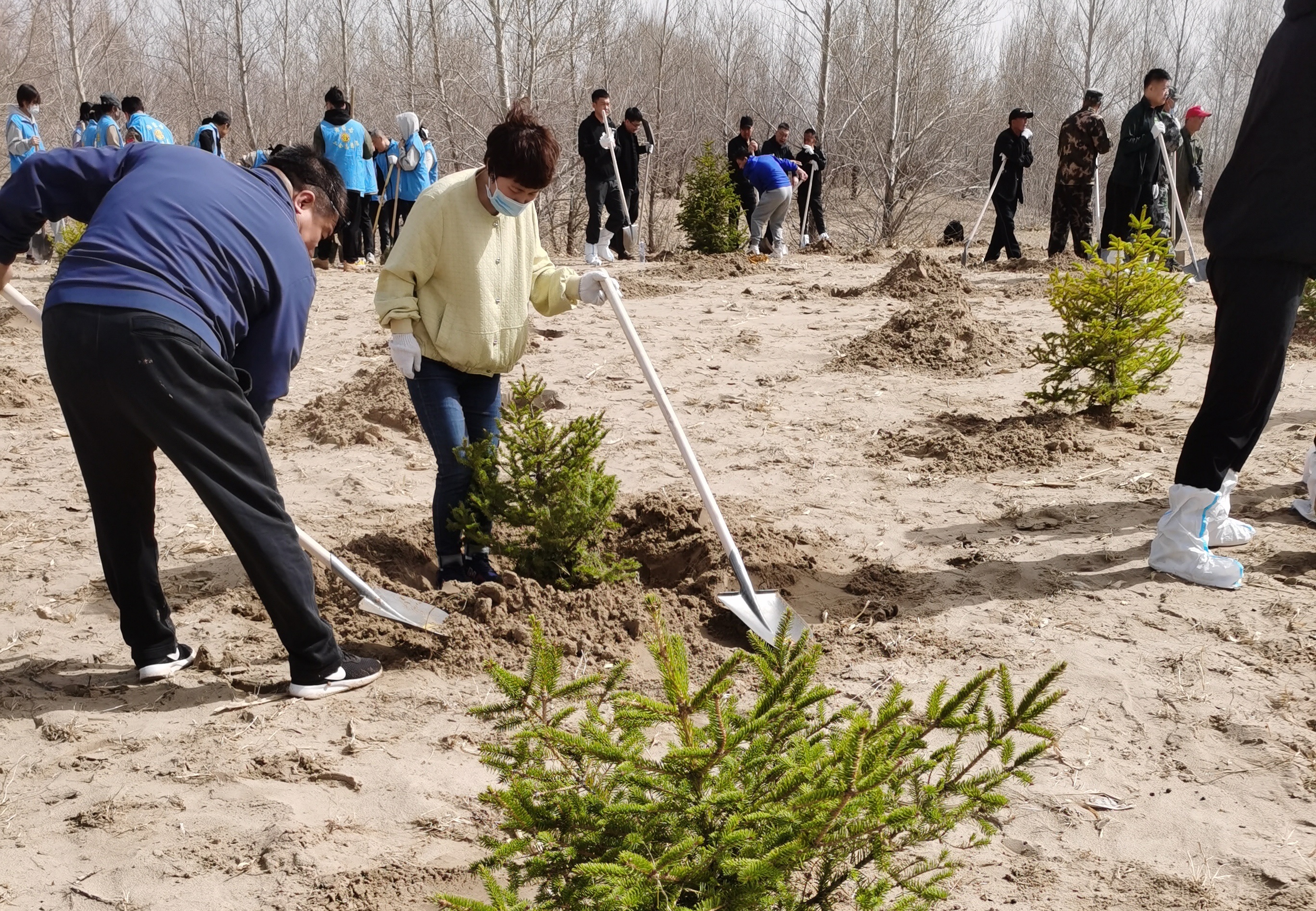 此次植树活动地点在大林镇宝林嘎查科尔沁沙地歼灭战项目区。三位老师组成一组,分工协作,扛苗载苗、挥锹铲土,同栽一棵树,自觉履行植树义务,植树现场一派忙碌景象。用实际行动诠释了感党恩、听党话、跟党走的决心。