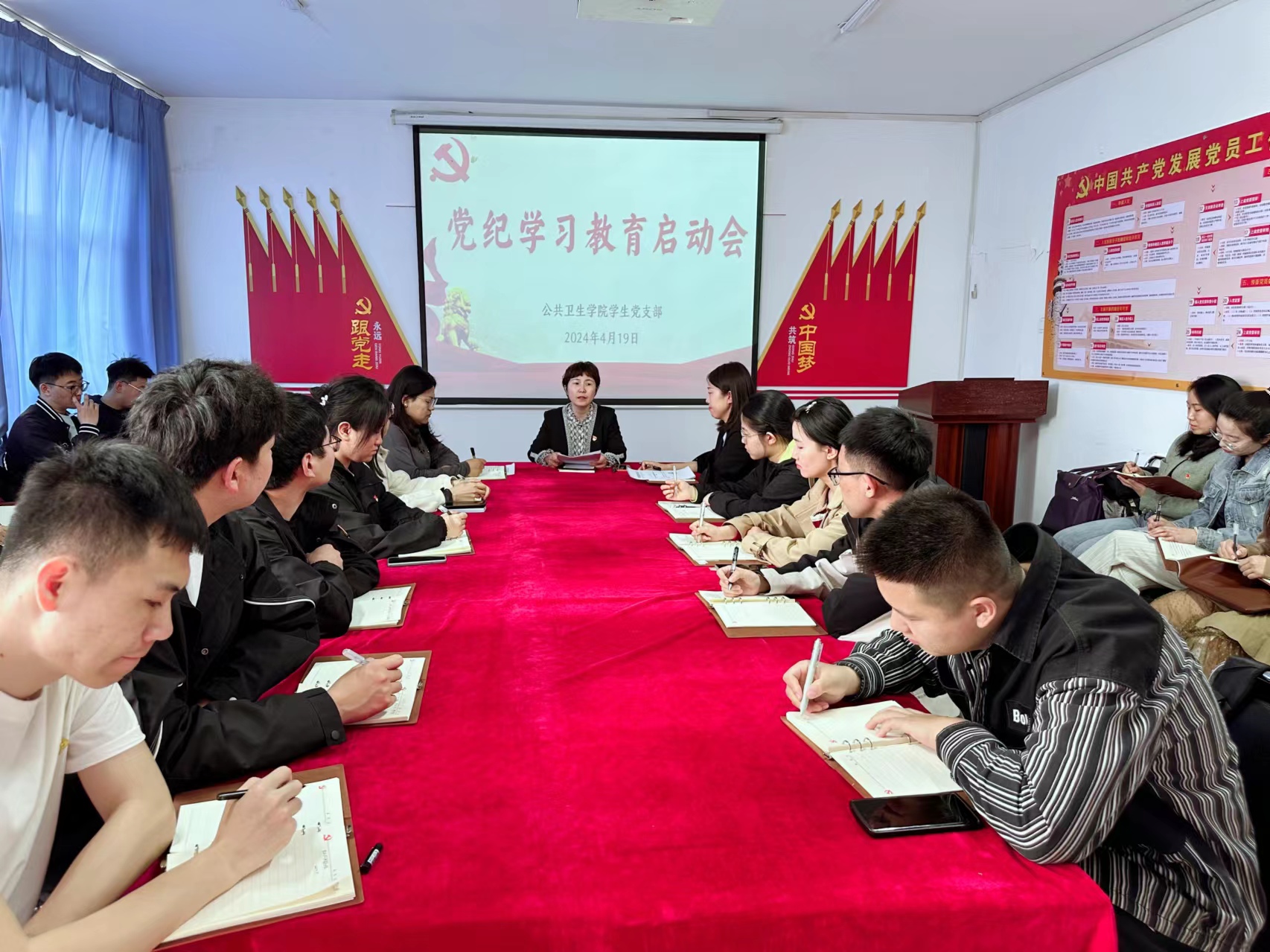 4月19日中午,公共卫生学院学生党支部在致远楼602会议室召开党纪学习教育启动会。会议由学生党支部书记乌兰图雅主持,全体党员参加会议。